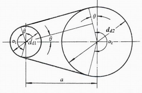 | 带轮包角 | V 带与带轮接触圆弧的圆心角, 通常 | |