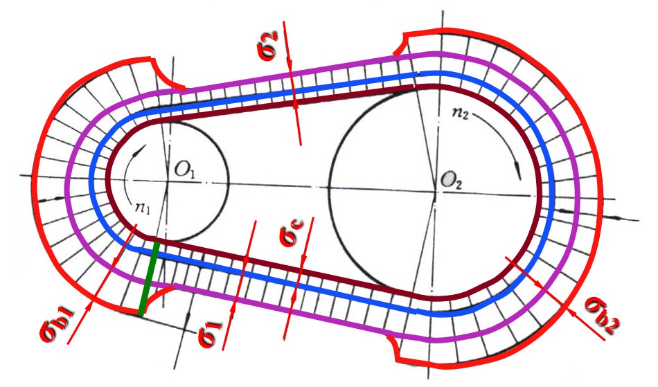 - 因此紧边拉应力最大, 松边最小, 圆弧介于中间