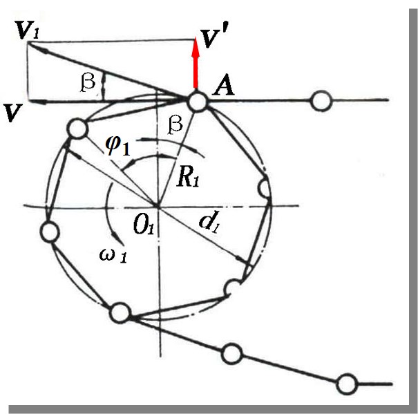 可得链条的速度周期性变化, 并且在链轮上周期性跳动, 称为多边形效应
