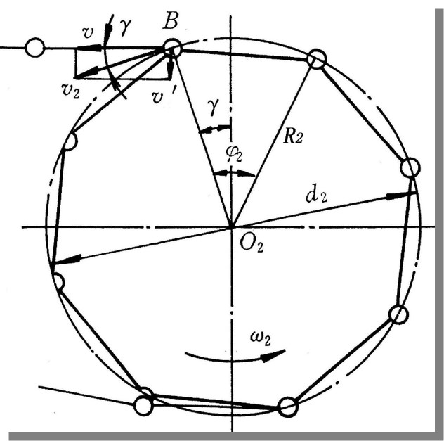 根据链条的特点, 链节在链轮上构成一个正多边形, 其中节距为多边形的边长, 链节的销钉为多边形的顶点