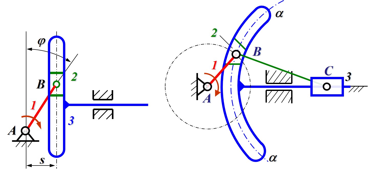 - 对于确定轨迹的摇杆, 可用一段圆弧导轨代替摇杆