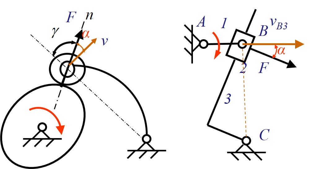 - 定义压力角 用于体现压力 的大小, 压力角越大, 在压力方向的分量越大, 满足 (注意压力角是传动力与驱动力的夹角)