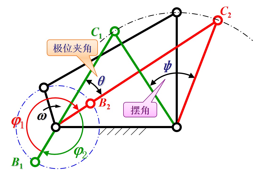 - 当曲柄与连杆共线时, 摇杆达到极限位置, 由于曲柄与连杆存在重叠与分离两种共线状态, 因此共有两个极限位置; 取曲柄在这两个极限位置下的锐角为极位夹角