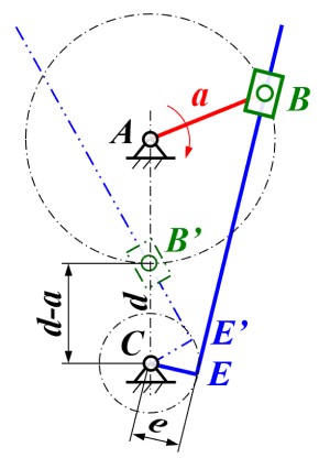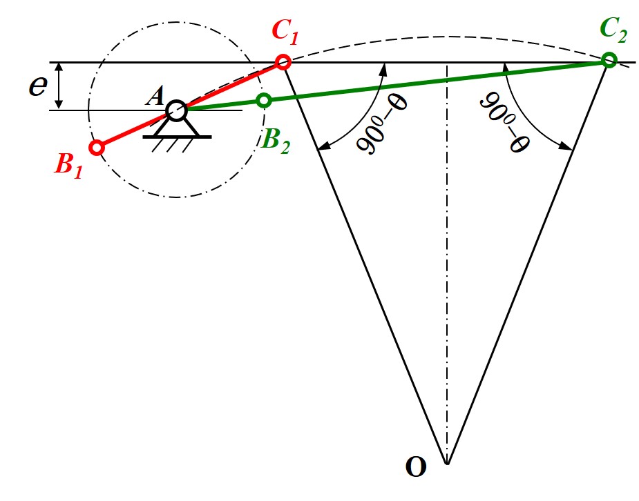 - 已知条件: 滑块移动的行程 (即极限位置距离), 曲柄铰链与导轨的偏距 , 行程速度变化系数