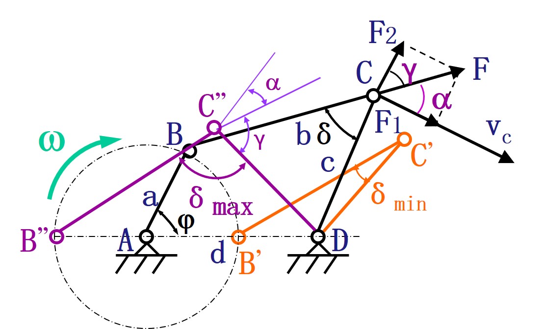 - 定义传动角 用于体现传动力 的大小, 传动角越大, 在传动力方向的分量越大, 满足 (注意传动角是压力与驱动力的夹角)