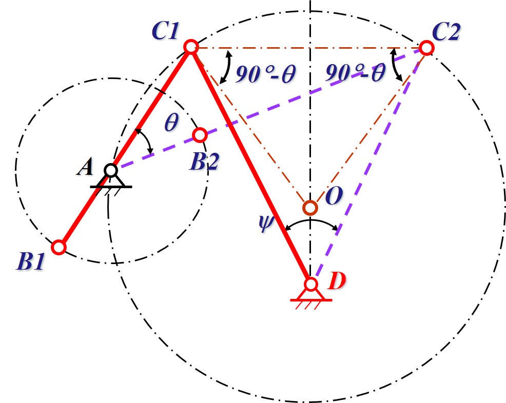 - 极限位置与曲柄铰链 之间连线的夹角即极位夹角 , 根据圆心角定律, 假设 在一个辅助圆上, 根据圆心角定律, 弦 的圆心角为 , 因此以 为底边, 做底角为 的等腰三角形即可得到辅助圆圆心