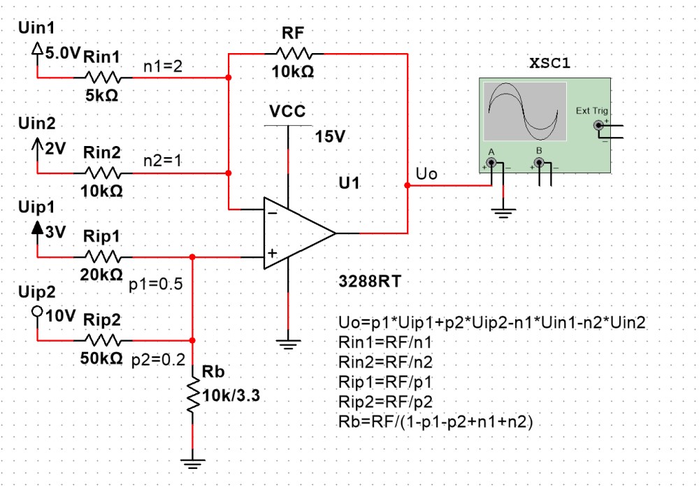 - 接在反馈电阻一侧的信号源为反相输出, 记为 Uinx, 电阻记为 Rinx, 根据系数满足 Rinx=RF/nx