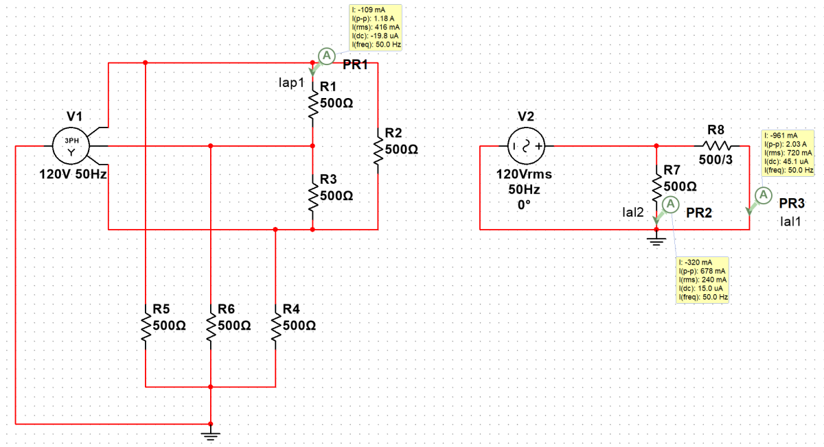 此电路中, 等效单相回路为两个负载并联, 且 Δ 负载上的电流为线电流 Ial1 , 单个负载上通过的实际电流为相电流 Iap1, 计算时需要转换