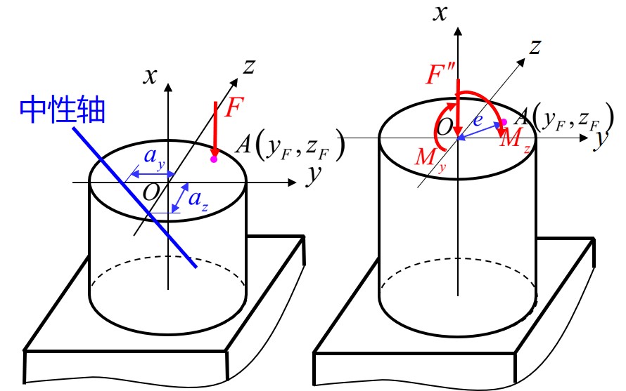 - 当轴力 (内力) 不过截面形心时, 需要将其平移至截面形心处, 同时对 轴产生弯矩, 因此截面将沿 方向发生弯曲变形 (注意弯曲公式的符号)
