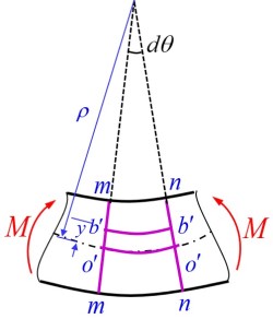 - 对变形后的圆弧取一个段 , 由于中性层不变的性质有 , 其中 为弯曲微段的曲率半径, 根据线应变的定义可得, 线应变满足
