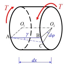 - 取微段 , 微段端面上有两点 , 在经过扭转变形后, 点变形至 点, 定义切应变为 变形的角度