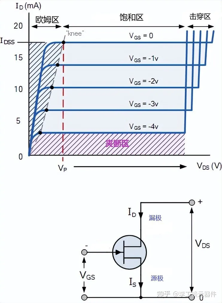 - 恒流区漏极电流( 与 关系非线性) $$I_D=I_{DSS}(1-\frac{V_{GS}}{V_{GS,off}})^2$$