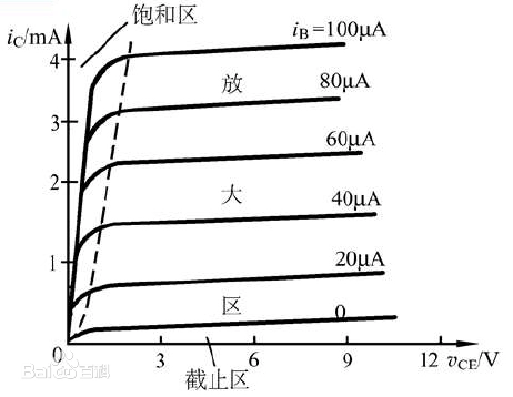 通常为断开, 当一个小电流流入与小正向偏压加载基极(B Basic)和发射极(E)上时, 处于导通状态(允许一个较大的集电极 - 发射极电流),